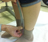 - ③靴下の口ゴムの位置を脚にマーキングする。