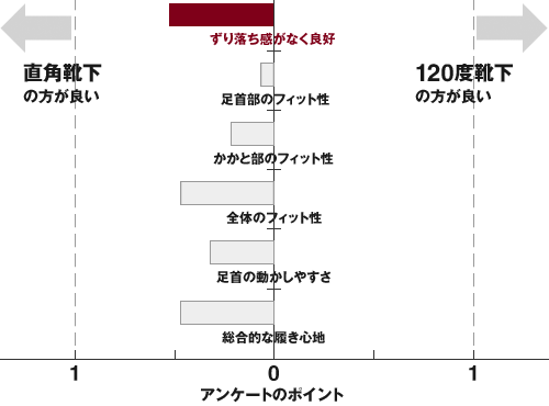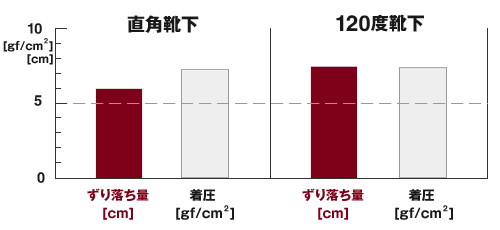 実験の結果から、どのタイプの直角靴下も、そうでない靴下と比較して「足首部分の締め付け圧力が少なくてもフィット感がありズレ落ちにくい」ことがわかりました。※
