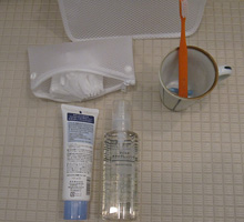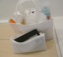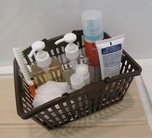 - 1)いつもお風呂に持って行くカゴやポーチ(中身の入った状態)の写真