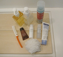 - ①いつもお持ちになる入浴用品をサンプル商品に入れて使ってみてください。