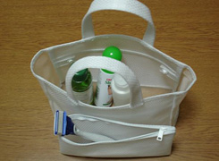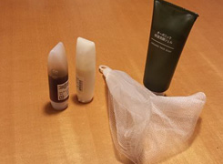- シャンプー、コンディショナー、ボディシャンプー、洗顔フォーム、ボディタオル(チャック付きポーチ中、はずして使用)化粧水、美容液、保湿クリーム