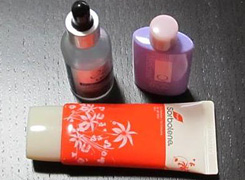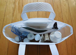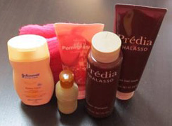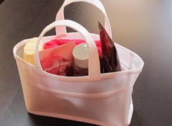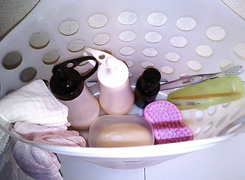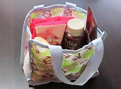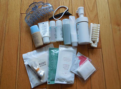 - シャンプー、ヘアトリートメント。ジェルメイク落とし、泡洗顔料、クレンジングシート、化粧水、乳液、風呂上がり用ファンデ、入浴剤、髪ゴム、ボディスポンジ、綿棒(4)、コットン(2)、携帯用エナメルリムーバー、ビニール袋(2)、輪ゴム数本、バレッタ、折りたたみブラシ