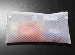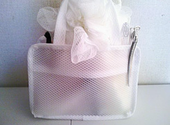 - 洗顔ジェル洗顔用のネット。無印の小分けチューブにいれたシャンプー。無印の小分けチューブにいれたコンディショナー