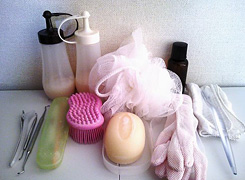 - シャンプー、コンディショナー、オイル、手荒れ防止手袋、石鹸、ガーゼハンカチ、歯磨きセット、ネイルブラシにしている歯ブラシ、ボディブラシ、コメドプッシャー、泡立てボール、ヘアクリップ
