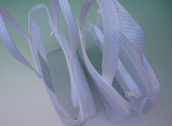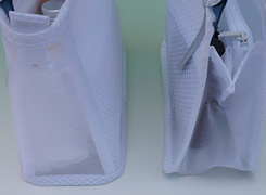 底をぐるりと縫うことで安定性が増し、たっぷり入るデザインになりました。持ち手を細くし、バックの外側に付けましたので、中身を取り出す時にじゃまになりにくくなりました。(改良点をわかりやすくご説明するために旧仕様品と並べています。左が新商品です)