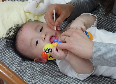 この唾液アミラーゼモニターを使って、赤ちゃんが着替えによってどの程度ストレスを感じているのか、また現行品と開発中の商品で差があるのかを調べてみたいと考え、実際にお母さんと赤ちゃんに来ていただいて着替えをしていただくモニター会を実施することにしました。