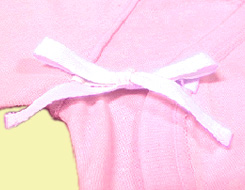 紐の内側と外側の色を変え、着替えのときの組み間違いを起こりにくくしました。内側は生地と同じ色、外側はオフ白の2色使いになっています。当初は紐の縁のステッチの色だけを2色使いにする予定でしたが、モニター会でお母さんから「紐の色が全部違ったほうがわかりやすい」とのご意見をいただき変更しました。