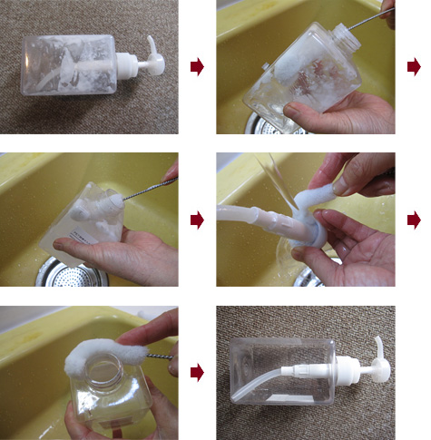 PET詰め替えボトルについてです。何度も使い続けているとアカのようなものが角についてきどんなにゆすいでも落ちなくなります。また、詰め替える時も一手間かかり不便なので、詰め替えパックがそのまま使えるようなデザインになるといいな。と、思います。よろしくお願いします。