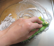 ボロ布でこすると、重曹と一緒に油汚れがぼろぼろとアカのように落ちます。