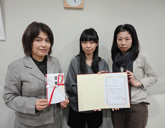 写真左から、高木富美子理事、当社インナーウェア担当 窪、子供担当 福島