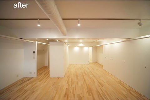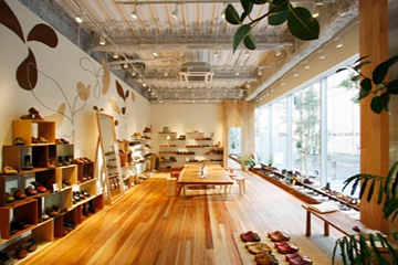 今、どうなっているかというと、こんなふうになっています。これは同じ空間です。ビフォー・アフターですけれども。靴屋さんのショールーム兼オフィスに変わっているんですね。フローリングだけあそこの大空間にばんと敷いて、ガラスの球をぼんと置いて。やっているのは大きくそれだけです。ガラスの中が主にオフィスで、暑いときとか寒いときはあそこで。でも結構ミーティングは1年の3分の2ぐらい、半分ぐらい外で、外と中の中間でやっています。靴屋さんなのでここで靴を脱いで上がって、試着しながらいろいろやれるというふうなシステムになっています。