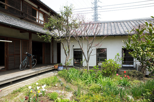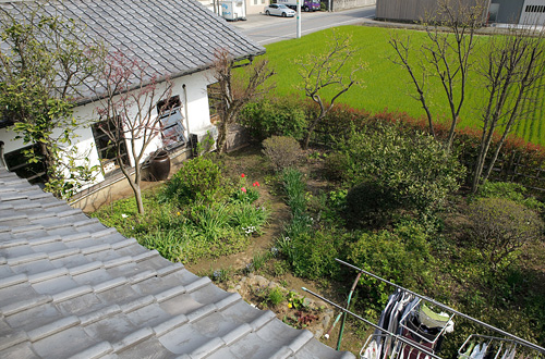 軒の深いぬれ縁があって、ここがなかなか気持ちのいい場所です。この庭は奥様がいろいろ考えてつくられているようです。菜園ではなく花とかそんな感じですね。