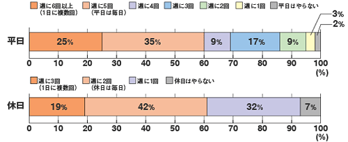 例えば料理。平日はほとんどご主人、家族が手伝いますね。これは、聞き方が難しいんですが。夫とか妻とかいう表現自体が誤解を招くこともある。つまり考え方として、妻が家事をしているなんていう前提で書くとクレームが来て、「なぜ女性だけが家事をする前提なのでしょうか」といった話も出て、確かにと。「配偶者」に変えたりして、聞き方もいろいろと苦労します。休日になると結構手伝ったり、夫婦一緒で食事をしたりしますね。最近では男の人も片づけはかなり手伝ってくれるようで、夫婦一緒に片づけをするって仲むつまじい感じがしますね。