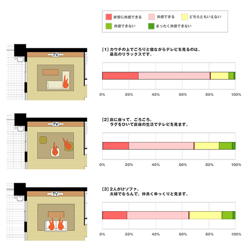 「床に座って」という人が多かったけども、実際絵にしてみると「カウチに座って」というのがいいというのが理想で、80%ぐらいいます。一方「床に座って」というのは70%ぐらいですね。「2人がけソファ、夫婦と並んで」が65%ぐらいです。これは年齢別で見るとおもしろいですね。「2人並んで」というのは30代ぐらいまでですね。こうした意見をもとに「床に座る」暮らしができるモデルルームをつくってみるんです。つくってみるととても関心を持ってもらえますし、また意見もくださいます。そしてさらにもう一度それを具体的に作っていくというサイクルを続けていったのです。