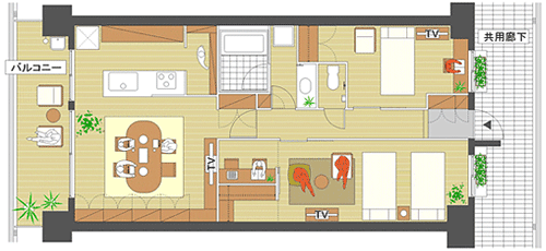 これは65平米のマンションです。ダイニングを充実させて大きなダイニングテーブルをつくり、食事をしない時もそこで仕事をしたり勉強したりできるようにしてみました。50%の共感度ですね。その一方、いやいや、個室をもっと豊かにしようかとか、ベッドルームの中にソファも置いて、個室の中に書斎コーナーもつけて、夫婦は夫婦の会話というか、そういう時間を楽しもうよとか。他には子供が少し大きくなったら子供の個室も披露した方がいいよねと。