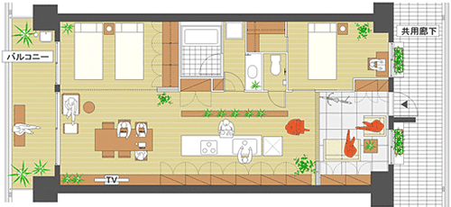 これはパーティプランというもので、半分がリビング。ここに玄関があって、床は同じ高さよりもちょっと上がっています。玄関を入って土間になっていて、そこでコミュニケーションもできるし、真ん中にセンターキッチンがあって、ダイニングがあって、ベランダとつながるリビングがあったり、というプランです。これも19%ぐらいですが、友達を呼んでというのは多くの人の理想のようですね、実際には人を家に呼ぶことは決して多くはないのですが。