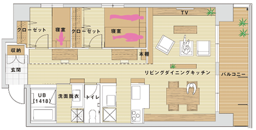 これは寝室について。寝室を大きくするのか小さくするのか。これはかなり小さいタイプです。その分リビングが大きくなるので、リビングを2つつくっています。1つは普通のリビングで、1つはごろごろと昼寝ができるようになっている。