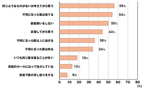 衣類を持たないためにどんな工夫をしていますかという問いです。同じようなものは考えてから買う、不用になった服を捨てる、家族で服の貸し借りをする、試着してから買う。あとはリストをつくっておくとか、いろいろな知恵やアドバイスがありました。