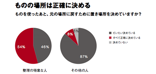 それで、この1割の人とそれ以外の人の習性を比較してみたのですが、得意な人は、モノの場所は正確に決める。「すべて正確に決める」が54%。その他の人は87%が「大体決めている」ですね。この正確に決めているか、大体決めているかの差が大きな差になってくるわけです。私もたくさんの家を見に行きますけども、本当に1割の人ぐらいしか整理整頓されていないです。人のことは言えないですけども、でも、本当にきれいにするって大事ですよね。家の中がきれいに整うと何か気持ちも整うし、安心した暮らしができます。何よりもモノというのは、モノの美しさというのはその背景が決めるところがありますから、いいものはきれいに整った中に置くことがとても大事なわけで、そういう意味ではなかなかできていないのが現代人です。日本人は特にモノが多いですね。