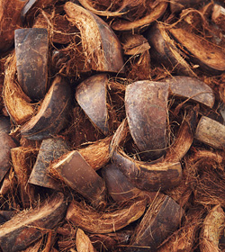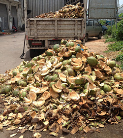 そして、そちらは中国の南の海南島の市場から届いた椰子の殻です。椰子の実を集めてきて中からココナツジュースやココナツミルクを採りますね。その外側はこうやって剥いで、普通は市場の横に山のように積んであって、しばらくすると町の清掃車ですか、回収に来る人たちがトラックに乗せていく。それでもう、それはゴミになってしまう。