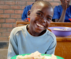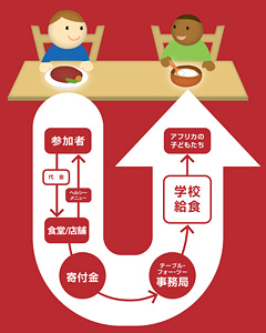 先進国に住む私たちが社員食堂や店舗などで、TFT対象となるカロリーを抑えたヘルシーメニューを購入すると、代金に含まれる20円が寄付金となります。この20円という金額は学校給食1食分と同等の価値があり、この寄付によってアフリカの子供たちに温かい給食が届けられるというものです。