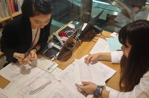 西澤さんはカバンをゴソゴソ探り、数枚の資料を出しました。前回の打合せの時、スタッキングシェルフにした場合のマスの数をお伝えしてあったので、その情報をもとに仲間やスタッフの使う棚の数や位置を考えて、わかりやすく色分けしてきてくれたのでした。
