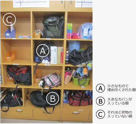 棚1つの大きさは幅60cm×高さ40cm×奥行45cm。仲間のカバンや作業で使うもの、ノートなどいろいろなモノが入っていました。よく見ると、小さなモノで埋め尽くされた棚(A)と、大きなカバンが入っている棚(B)と、それほど荷物の入っていない棚(C)の、3種類に分かれていることが分かりました。割合的には、(C)が多いように感じました。