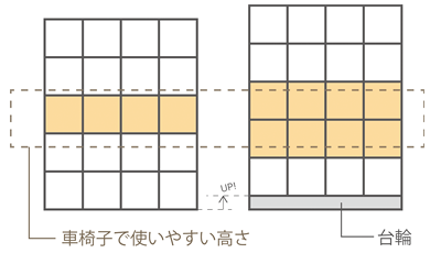 台輪を入れて床から底上げ出来れば、1段目は床から離れるので、汚れを気にしなくていいようになります。そればかりか、全体がかさ上げされることで、少し低いと感じた2段目のマスが車椅子でちょうど使いやすい高さになります。