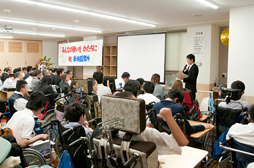 開所式では、まず仲間たちから施設建設に協力してくれた方々へ感謝状が贈られました。つづいて建設活動を振り返るビデオ上映が行われると、目に涙を浮かべながらビデオをご覧になっている方もいらっしゃいました。「あまーち」の皆さんから私たちに贈られる言葉には、感謝と今後の決意を込められていました。新しい施設を建てたことは一つのステップで、これからも目標に向かって走り続けていくのだな、と改めて留らない「あまーち」の凄さを感じました。