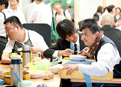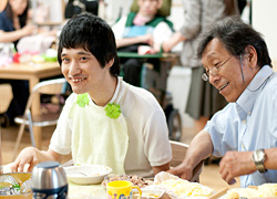 新施設では、大きな厨房ができたおかげで、仲間と職員とが同じテーブルで一緒に同じお昼ご飯を食べるようになったそうです。一緒に食事をする仲間と職員の距離感は、とても心地よいものでした。仲間ができることは仲間がやって、職員はできないことをサポートする。「あまーち」らしさを象徴するような光景でした。