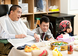 建物の見学が一通り終わると、何と手作りのお昼ご飯が待っていました。「あまーち」で働く皆さん、そして仲間のお母さんたちが、温かく美味しいご飯を振舞ってくれたのです。仲間も、職員も、招待された人も、みんなが木製テーブルに集まって、笑い、語り合いながら、一緒に食事をとる。普段、家庭で使われているダイニングテーブルが福祉施設でどんな風に使われるのか、提案のときは、十分にイメージが湧かないこともありました。しかし、実際には家具がふつうに馴染んでいて何だかホッとしました。使い手によって建物や家具は様々な表情を見せ、使いこなされていくのだな、としみじみ感じました。