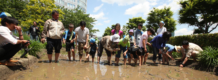 以高楼大厦为背景,大伙种植水稻的照片。这还不算惊人,知道该稻田居然位于东京六本木的现代化大楼屋顶的人,肯定会目瞪口呆。屋顶绿化的风潮已经到了这个地步。这次为了度过稍微凉爽的夏天,我们思考一下屋顶花园和菜园。