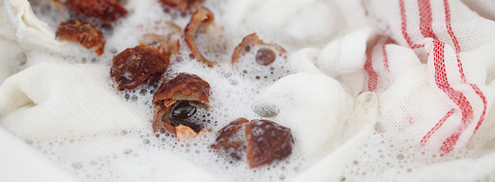 有人在洗衣时使用一种被称作"洗衣果"的树木果实。日本名称叫做"无患子"(首页图像便是无患子)。这种果实富含天然表面活性剂皂甙,在肥皂普及前常用于洗涤,坚硬的黑色果核也常被用于毽子板羽毛键或念珠材料。东京家政学院大学的研究结果表明,无患子果实的去污力可达到标准洗涤剂的50%。追求"环保洗涤"的人们将这种果实称作"环保洗涤剂",常用于衣物及餐具的洗涤。此外,也有人在洗衣时只用倍半碳酸钠等碱性溶剂。碱性溶剂是分解皮脂等油渍、存在于大自然的无机物,即使被冲走也不会增加环境负荷。洗后均具有清爽的洗涤效果。轻度污渍时,试用一下这种溶液应该也不错吧?