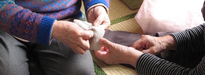 响应号召、携带衲布作品前来参与的是以大槌町为中心的20岁到80岁年龄层的女性居民,人数约达60人。大家来自不同的年龄层和环境,也并非都是喜欢针线活的人。但她们都带着"活在当下"的强烈愿望,这也成为她们"想要做些什么"的原动力。整天躺在避难所无所事事的老人、因失去家人而在临时住宅中以泪洗面的人通过"衲布"这种手工作业,重新找回生存的喜悦,逐渐开始走出悲伤。于是,这种与东北地区有着深厚渊源的手工作业作为一种新的生存价值和微弱的生计来源,开始在当地女性居民中生根发芽。