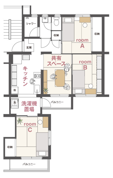 ・共有スペースを利用しやすい位置。シェアルームらしさは1番!
