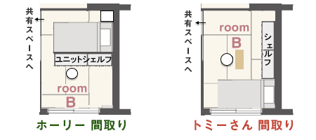 同じ6畳間でも押し入れ収納がないので、ルームAより2畳ほど床が狭いです。未知数過ぎて前評判がよろしくないルームBですが、レイアウトの自由が効きやすいということで、ホーリーもトミーさんも個性の出る作りになりました。