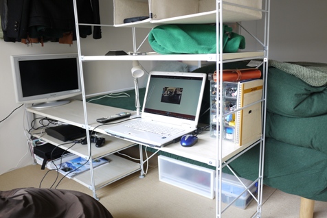 例によって季節物は小天井の上へ置き、本や工具はベッド下のPPケースへ移動。ユニットシェルフへ入りきらない物は、思い切って処分。部屋の中央をシェルフで分割できたので、ルームAより広い作業スペースを作ることができました。