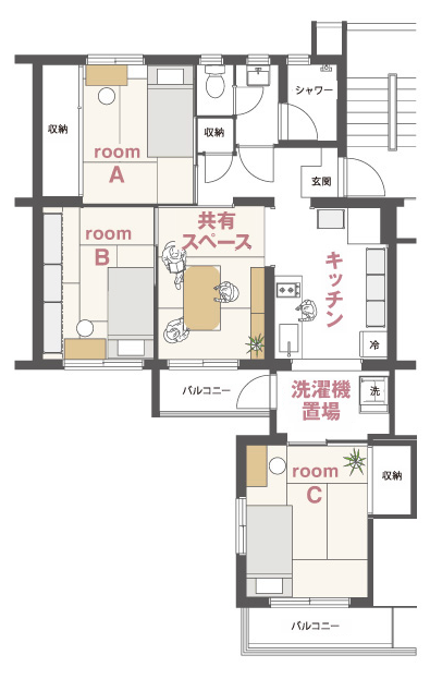 シェアルームデビューには、まずこの部屋でシェアと1人暮らしの両取りからはじめてみるのが良いと思います! 慣れてきたらルームA、ルームBと移ってみて、自分の距離感にあった部屋が見つかるといいですね。