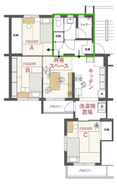 外出の時間がシェアメイトと被ると取り合いになるので、そこは実家でのお母さんとの日々を思い出してヤリクリしてほしいですね。