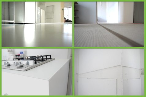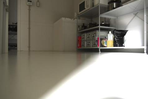 まっしろ空間に使われている床材です。感覚的には、賃貸住宅によく使われている、ウレタン材のなんちゃってフローリングに似ています。シート材なので厚みはありませんが、爪で押すと跡がついて、ゆっくり戻ります。