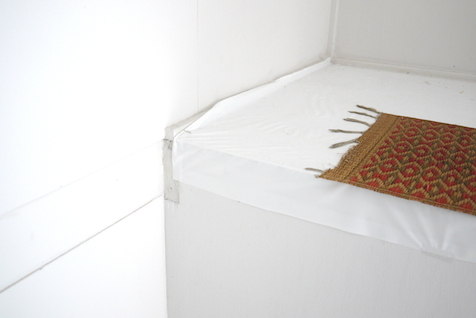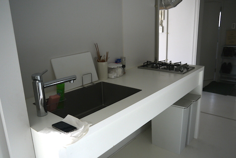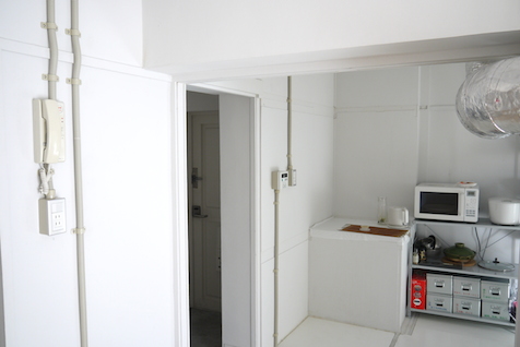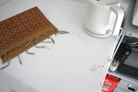 キッチンスペースの角にあって、ちょうど給湯器のある場所。コーヒー紅茶を淹れる場所ということで、凸凹の面に液体をこぼすと、隙間にはいって手入れが面倒です。なので千里シェア大使は、入居時にクロスをかけて保護してしまいました。