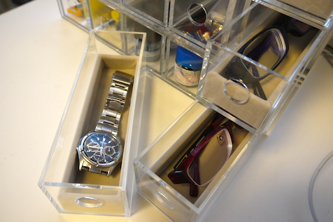 以前チラッとお目見えしていたアクリルメガネ・小物ケースですね。こんな感じに