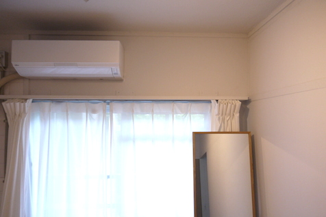 千里シェアルームはじめ、MUJI×URのリノベーション住戸はカーテンレールがちょっと変わってます。2本のレールを固定するのに天板のようなものを用いていて、そのおかげで上に物をのせることができるんです。白バックが映える!
