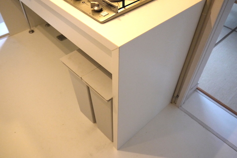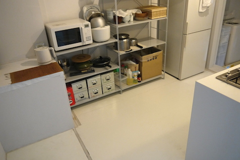 ここはキッチンとも直結していて、一帯がデンジャーゾーンと化しています。無印良品のキッチンは基本オープンなつくりですから、近づけないに越したことはありません。共有スペースとの間に仕切りを作るのが良さそう。