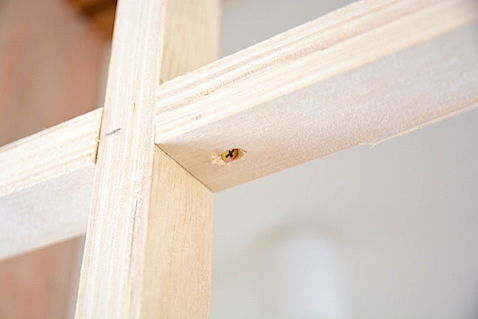 左にある柱を固定するため、反対側からもビスを打っています。だからぶつからないよう、中心側は1本でとめました(外側の柱に固定する方は2本)。