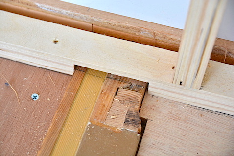 ココも他と同様にすこし突っ張らせて、位置を確認しました。ビスは垂直に入らないので、向かって右下から斜めに2本いれています。