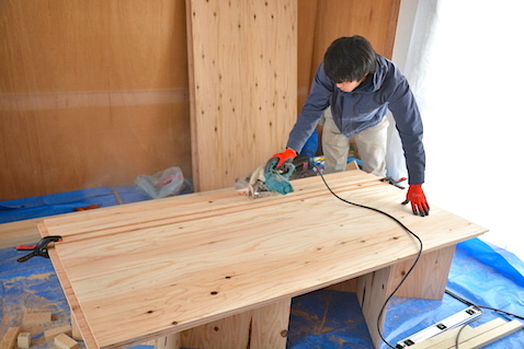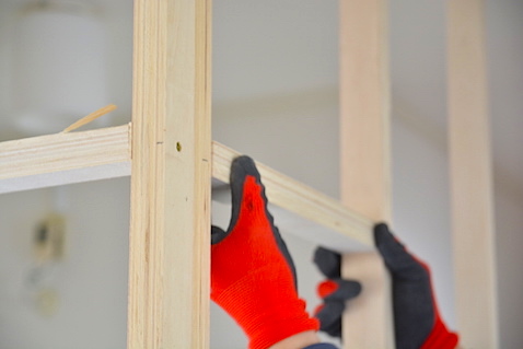 さらに、いま立てた柱を挟むようにしてヨコ棒を追加しています。これで下地の1面が完成しました。この下地に、ビスで合板を固定していくことになります。