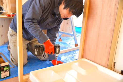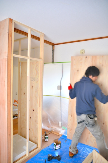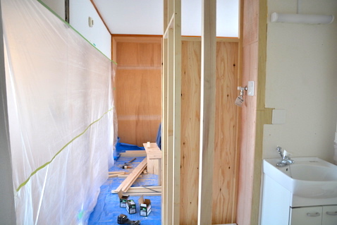 前回までの作業で、洗濯機周りに間仕切り壁の下地を作ることができました。今回はここに壁となる板を貼っていきます。
