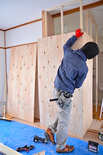 ちなみに、この下地2面をつくるのに約2時間かかりました。棚をひとつ作るにしても、初めての方や不慣れな方はもっと大変でしょう。資材置き場のような場所が確保できると、作業がグンとやりやすくなると思います。