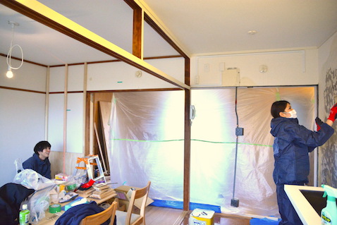 壁紙を剥がした壁面の模様や今回の壁たてで、印象が変化し始めたのが実感できます。それにしてもトーリー(嫁)、すごくキレイに壁紙を剥がしてくれました。